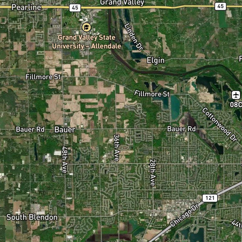 Daily life here moves at a different pace than it does closer to the city—you've got coffee steps away, a grocery less than a mile down the road, and enough restaurants within walking distance that you're not mapping routes just to eat dinner, yet the 4,800-acre spread means there's genuine land between houses, the kind of breathing room that costs around $495K to claim. Georgetown charter township has the low municipal tax rate and the parks to match its suburban bones, and Hudsonville Public School District serves the area. Downtown Grand Rapids sits about 21 minutes north when you need it; the airport another quarter hour past that. Hager Park is just over a mile away for the small-scale outdoor stuff, and a boat launch at Georgetown sits at 1.5 miles if the water calls. This is ranch-home country—straightforward architecture, open lots, the kind of place where the appeal is what's *not* there as much as what is.