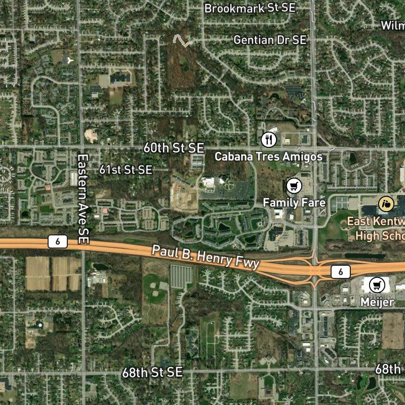 The strip of 60th and Kalamazoo hums with the kind of low-key commercial energy that actually works—grocery stores and coffee shops at arm's reach, restaurants numbering in the dozens within a mile, all of it threaded together by proximity rather than pretension. Ranch homes dominate the streetscape, the kind of straightforward architecture that doesn't demand much attention and doesn't need it. This is Gaines charter township material, the kind of place where you run errands on foot and somehow end up somewhere you meant to go anyway.