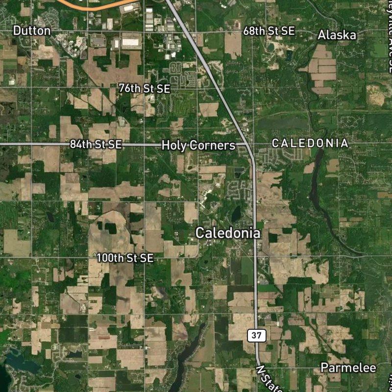 Early morning or dusk is when this stretch really shows itself—the light hits the traditional homes right, and you can see how deliberately the neighborhood spreads across those 2,267 acres. It's rural enough that you've actually got space between houses, but dense enough that a grocery or one of the 48 restaurants within a mile is basically steps away, which sounds contradictory until you're living it. The schools here feed into Caledonia Community Schools, and if you want to hit Gerald R. Ford Airport it's about ten minutes, though most people are heading toward downtown Grand Rapids (closer to 26 minutes) or staying put—there's a coffee shop a nine-minute walk away, Emmons Lake less than a mile out, and Caledonia Lakeside Park where you can actually get on the water. Homes run around $413K, and you're in Caledonia township, which has been growing steadily without losing its rural bones.