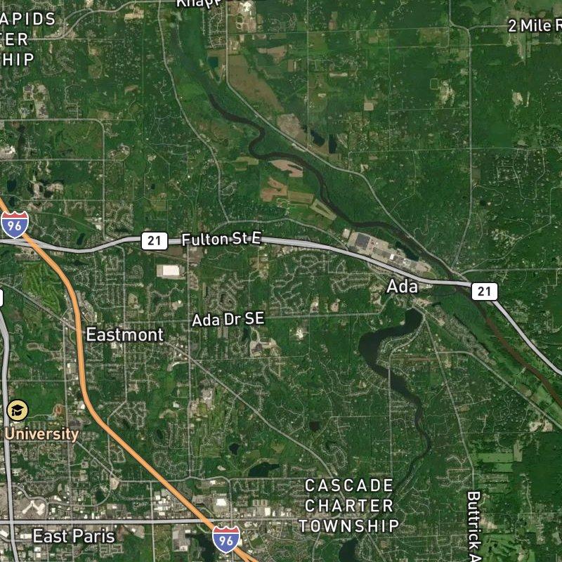 The Ada Dr & E Fulton St Area sits at the heart of Ada township, where you're surrounded by thirty-six restaurants within a mile—everything from quick bites steps away to serious dinner spots that actually justify leaving your house. The neighborhood anchors around dense commercial and mixed-use corridors, with a grocery store a five-minute walk out and Carl Creek Wetlands Preserve just twelve minutes on foot if you need to clear your head. You've got about 1,400 acres to explore here, which means real breathing room without feeling remote.