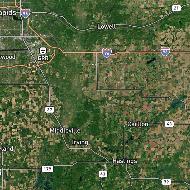 You're looking at open country here—nearly 10,000 acres of it—where brick ranches and wood-sided homes sit comfortably spaced across Bowne township, about 20 miles southeast of Grand Rapids. The nearest grocery is a short drive at 4.1 miles, and restaurants cluster around the 2-mile mark, so you're doing a little traveling for errands, but that's the trade-off for the land. Homes run around $371K and feed into Caledonia Community Schools. If water draws you, Campbell Lake sits on the eastern edge with a public launch just 3 miles away, and the Dolan Nature Sanctuary opens up less than a mile and a half down the road. Downtown Grand Rapids is roughly 33 minutes by car, Gerald R. Ford Airport about 21—close enough to the city without feeling like you live there.