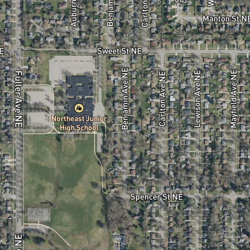 Bonnie Homesites sits in the northeast corner of Grand Rapids, where wooded yards and 1940s–1960s homes back up to pockets of old-growth trees—the kind of place where you'll spot deer and wild turkeys on morning walks. At just over 10 acres with lots averaging a fifth of an acre, it's got room to breathe without sprawling too far from what matters: downtown is a nine-minute drive away, Ball Perkins Park with its groves and trails is a 12-minute walk, and you've got grocery stores, restaurants, and coffee shops within a few minutes on foot. Homes here run around $314K, which gets you into something real in a neighborhood that mixes affordability with genuine access to the whole city.