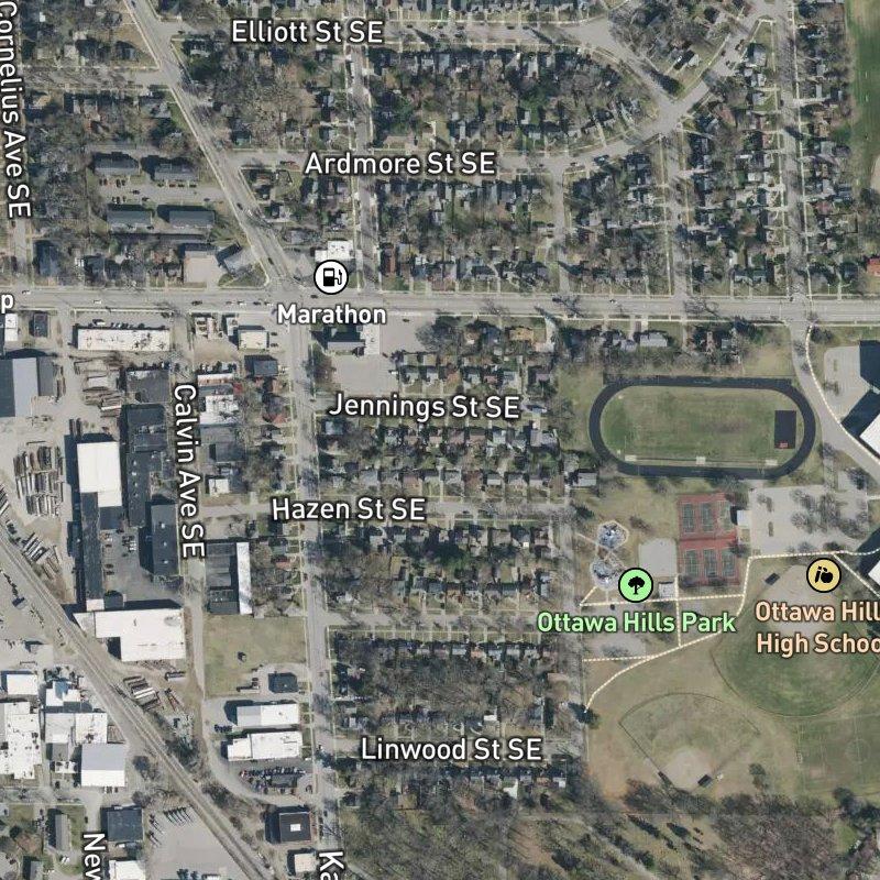 The lot lines here are tight—0.13 acres per plot—which means you're buying proximity to everything, not acreage. Bosma Add. No.2 sits within Alger Heights, a one-square-mile neighborhood where most errands happen on foot: the nearest grocery and coffee shop are both under a mile away, and there are 18 restaurants within walking distance. Ottawa Hills Park is a three-minute walk, one of ten parks you can reach without a car. Downtown Grand Rapids is 11.6 minutes away by car, and the airport another five minutes beyond that. Homes here run around $293K, and Grand Rapids Public Schools serves the area. A transit stop sits steps from your door. This is the kind of subdivision where you're trading square footage for location—smaller lots, denser neighborhood, everything nearby.