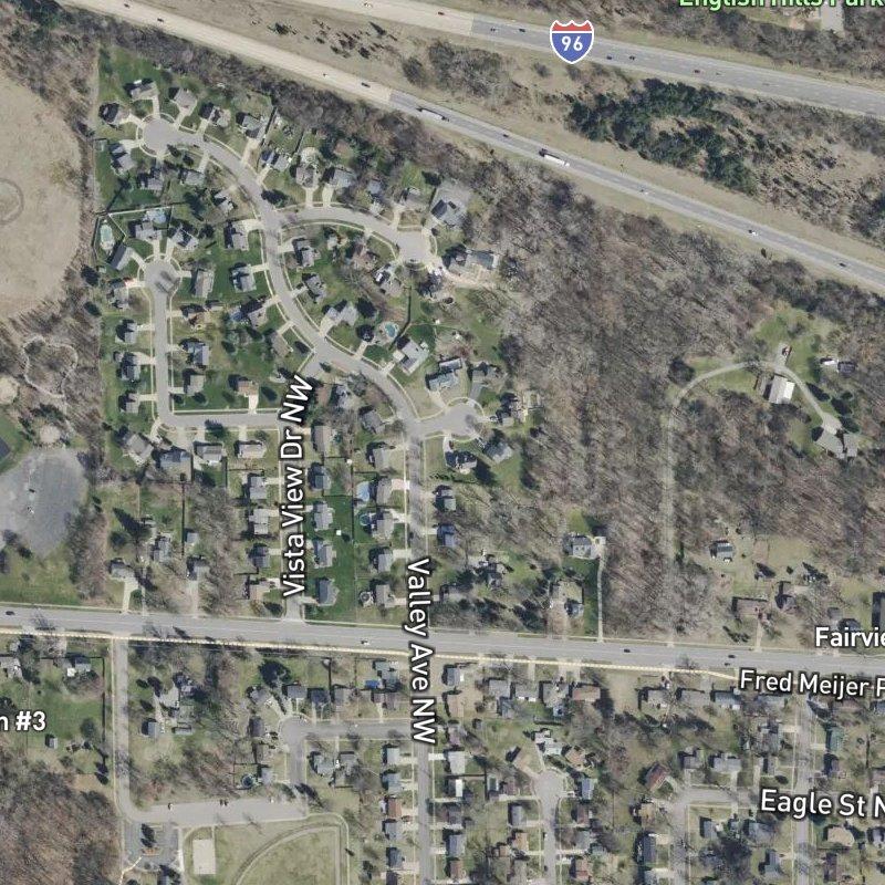 Bristol Avenue and 3 Mile Road cut through a 387-acre neighborhood in Walker city, where suburban residential blocks meet steady commercial flow just northwest of downtown Grand Rapids—a 10-minute drive away. The area sits dense with dining and daily needs: 180 restaurants and 36 grocery stores within a mile or two, with a coffee shop and restaurant steps from most addresses, and a transit stop equally close. An unnamed park is a 3-minute walk, part of a cluster of five parks within the surrounding mile. Schools feed into Walker Charter Academy, while homes here range around $364K. The Gerald R. Ford airport lies 26 minutes out, and the real anchor—Millennium Park, one of the nation's largest urban parks at 1,400 acres—sits just beyond the immediate neighborhood, close enough that its open space shapes the rhythm of daily life here.