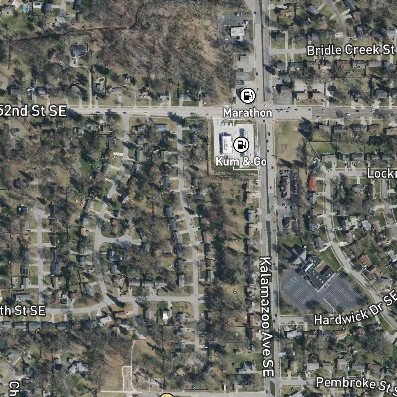Drive through Brookwood Plat and you're moving through a modest 10-acre grid of homes where the pace feels just right—close enough to downtown Grand Rapids (about 16 minutes) and Gerald R. Ford Airport (just over 10) that you're not isolated, but far enough out that you've got actual land breathing room. The nearest restaurant is less than a mile away, and there are around 30 dining spots within walking distance if you're willing to venture out, with grocery stores and a coffee shop each roughly a mile down the road. Transit access sits right at your doorstep, which doesn't hurt. Schools feed into Kentwood Public Schools, and when you want to shake off the day, Pinewood Park is about an 11-minute walk away—one of four parks clustered within a mile. Homes here run around $343K, settling into the 52nd St & Kalamazoo Ave Area where older established blocks mix with newer subdivisions and the whole thing has that West Michigan feel of being close to everything without feeling crowded.