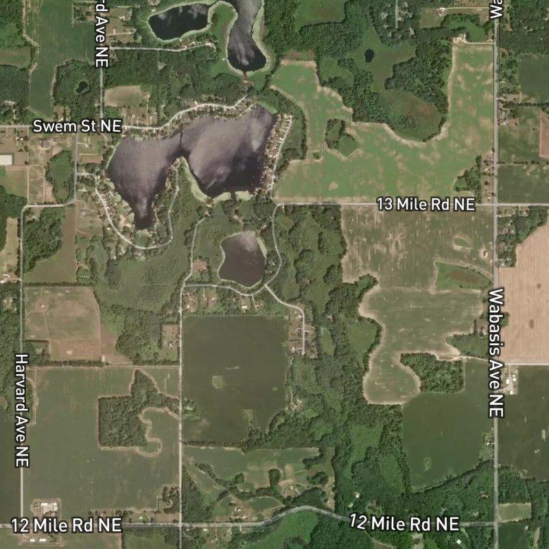 —so it's basically a condo community sprawled across 111 acres with each unit sitting on roughly 2.2 acres. That's the kind of space most condo owners never get. Brown Lake is practically at your doorstep—about a tenth of a mile away—and if you've got a boat, Wabasis Lake Park's launch is just 1.5 miles south. Wabasis County Park runs about a mile and a half out, good for a day trip without overthinking it. The median home value hovers around $454K, which buys you a lot of breathing room in a condo setting. Greenville Public Schools serves the area. Downtown Grand Rapids is a 38-minute drive if you need it—close enough to not feel remote, far enough to actually have land under your feet. The location sits right at the intersection of Wabasis Ave and 12 Mile Rd, so navigation is straightforward. If you're the type who wants condo ownership without cramped quarters or a parking spot as your outdoor space, this is the answer.