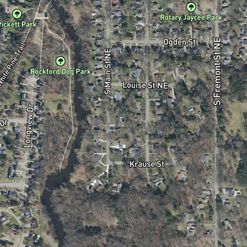 Just west of downtown Grand Rapids and about a half-mile from the Rockford-Rogue River launch, this 10-acre subdivision sits in the kind of location where you're close enough to the city for a quick drive—around 20 minutes or so—but anchored in a neighborhood with real walkable depth: a grocery store roughly 11 minutes on foot, a coffee shop and restaurant scene within 6 minutes, and 78 restaurants within a mile if you want options. Homes here run around $443K, with lots averaging 0.38 acres, and you're in Rockford Public Schools territory. The Rockford Dog Park is a 3-minute walk away, and there are 25 parks within a mile, so if you're the type to spend weekends on the water or exploring local trails, the boat launch is practically next door.