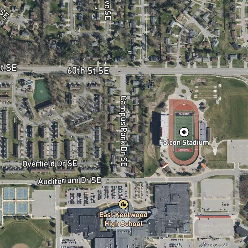 Situated just east of Grand Rapids, Campus Estates occupies a 6-acre plot in a corner of Kentwood where the suburban landscape opens up on one side and urban convenience anchors the other—you're roughly 17 minutes from downtown and 11 minutes from Gerald R. Ford Airport, which matters when you're trying to split the difference between space and access. The grocery is about a seven-minute walk, a restaurant maybe six, and there's genuine density nearby: nearly a hundred restaurants within a mile, plus transit that's just five minutes on foot, which means car life isn't mandatory even though the area reads more car-oriented overall. Kentwood Public Schools serves the subdivision, and there are three parks within walking distance—one an unnamed spot about twelve minutes away—so the land itself has room to breathe while everything you'd actually use sits close enough to reach without overthinking it.