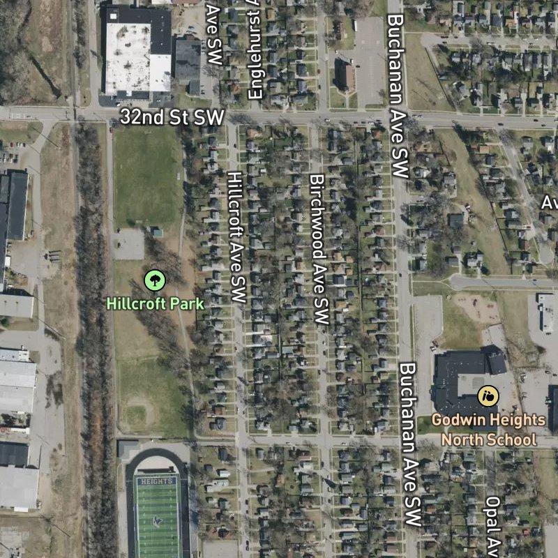 Carman Plat is a 21-acre subdivision where the grid of streets and modest homes—most hovering around $250K—feels genuinely lived-in rather than newly minted, the kind of place where you're eight minutes from downtown Grand Rapids but still surrounded by three parks within a mile. Hillcroft Park sits just two minutes on foot, and a grocery store, coffee shop, and one of 36 nearby restaurants are all within a ten- to fourteen-minute walk, making errands feel less like drives and more like errands. Kids go to Godwin Heights Public Schools, and when you need to catch a flight, Gerald R. Ford airport is nineteen minutes away—close enough that you won't spend your whole morning in the car. The real signature detail, though, is how much is actually walkable without the neighborhood feeling dense; the transit stop sits just six minutes on foot, which means the place has infrastructure without feeling crowded, suburban comfort without the isolation tax.