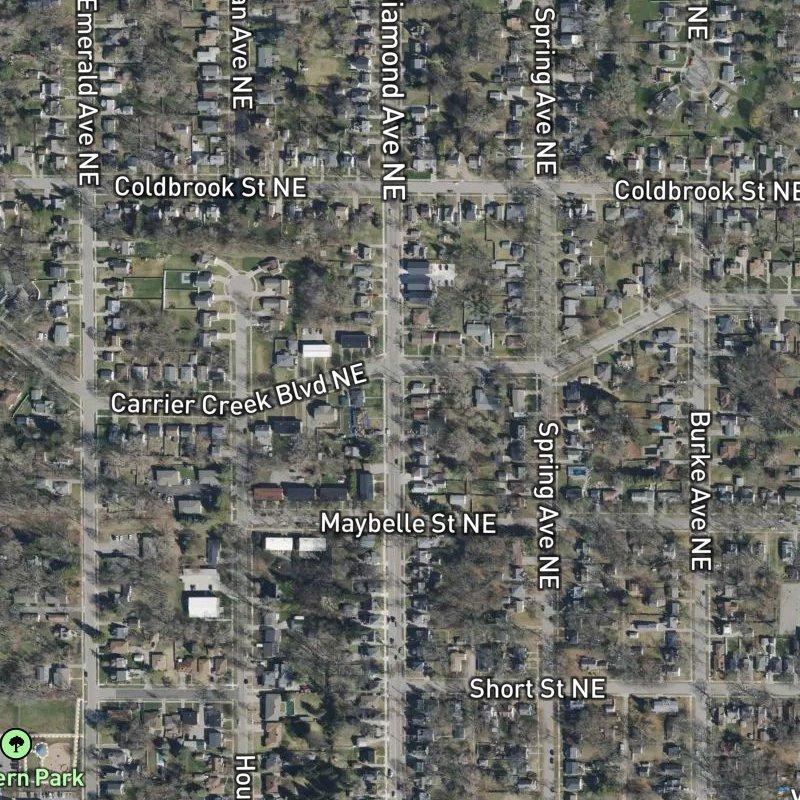 The moment you turn onto the quiet streets of Carrier Creek Sub., you feel the density drop away—seven acres of breathing room in a neighborhood where most people walk to what they need. Downtown Grand Rapids is just seven minutes north by car, but this corner of Highland Park holds its own: restaurants cluster within a mile (168 of them), a grocery is a seven-minute walk, and coffee shops are closer still. Eastern Park sits a short walk away, one of seven parks within a mile, so there's green space without having to hunt for it. The Grand Rapids Public Schools serve the area, and transit access is immediate—the nearest stop is two minutes on foot. Homes here run in the mid-$300Ks to low $400Ks, offering the feel of a quieter pocket without sacrificing the convenience that makes the neighborhood work.