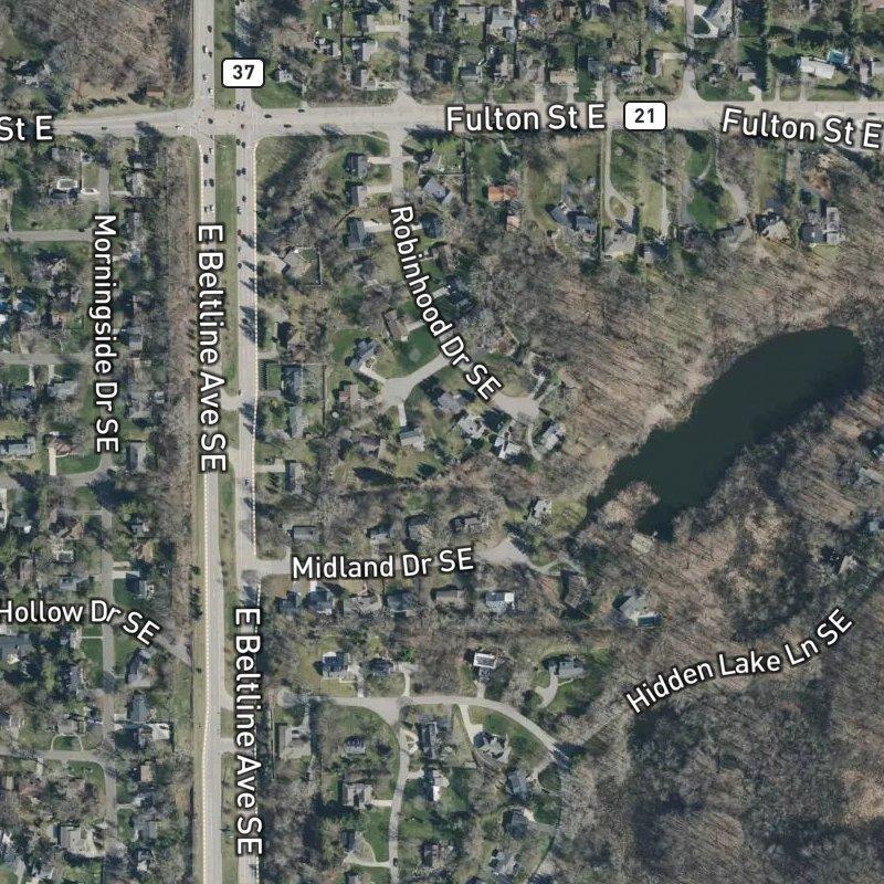 Early evening light hits the brick and stone fronts best—that's when you notice how the 24-acre layout lets homes breathe on half-acre lots without feeling remote. You're about a mile and a quarter from groceries and restaurants, which means a quick drive rather than a walk, but close enough that you're not commuting just to eat. Forest Hills Public Schools serves the area, and homes here run around $487K. The real draw lands at the end: Hidden Lake sits just a tenth of a mile away, and Cascade Community Association Park is an eight-minute walk, part of three parks within a mile. That combination—space, water access, and outdoor amenities without urban density—is what keeps people rooted here. Downtown Grand Rapids is 10 minutes away when you need it.