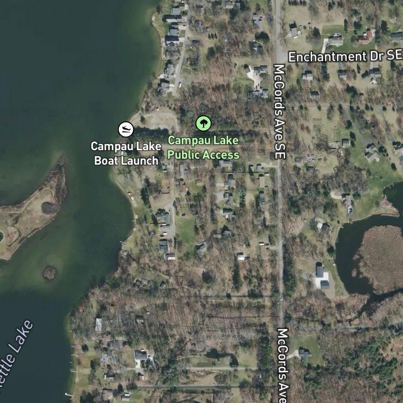 The boat launch is practically in your front yard—a tenth of a mile to Campau Lake, where the water sits calm and close. Channel Park is a 14-acre subdivision in the Garbow Plat Area, where lots average just under three-quarters of an acre and homes hover around $376K. You're 27 minutes from downtown Grand Rapids, 14 minutes from Gerald R. Ford Airport, and surrounded by 18 restaurants within a mile—enough variety that you're never eating the same thing twice. A public access point to Kettle Lake sits nearby too, and the nearest restaurant is a 10-minute walk, so Saturday dinner doesn't always require the car keys. Caledonia Community Schools serves the area, and the whole setup trades density for the kind of land and proximity to water that tends to define how people actually spend their weekends here.