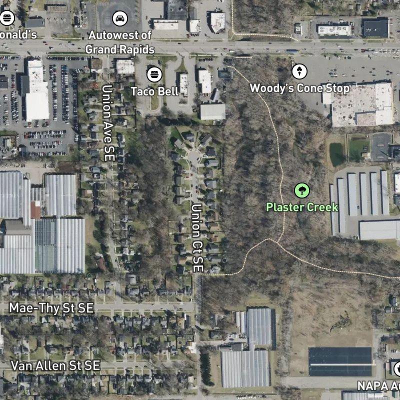 Clafor Plat sits on 7 acres in a pocket where downtown Grand Rapids is just over 10 minutes away, yet the neighborhood has the feel of something more contained—small lots at a quarter-acre each, the kind of scale where you notice details. A restaurant is practically at your doorstep, and Plaster Creek park is a three-minute walk; within a mile there are 42 restaurants and 9 parks scattered around, so the area has real density without feeling cramped. Transit is two minutes away, grocery stores are a 12-minute walk, and Gerald R. Ford Airport sits about 18 minutes off. Homes here run around $304K, and the area feeds into Vista Charter Academy. It's the kind of subdivision where proximity does the heavy lifting—everything's reachable without much fuss.
