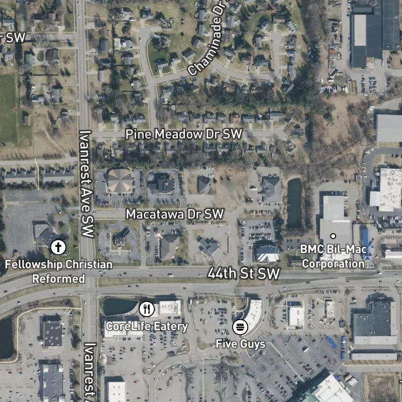 ...and that's why we ended up here at Cora Office Complex. It's eleven acres of straightforward commercial real estate wedged right where Ivanrest Ave meets 36th Street, with everything you'd want for running a business without the downtown overhead. You're talking about a fifteen-minute drive to downtown Grand Rapids, twenty-four minutes to Gerald R. Ford Airport—close enough that you're not wasting your day commuting, but far enough that rent doesn't eat your lunch. A grocery store is a five-minute walk, and there are literally a hundred and eighty restaurants within a mile, so lunch meetings aren't a problem. Transit access is right there at your door, and Kent Trails Spartan Industrial Trailhead is a seven-minute walk if you need to clear your head between calls.
