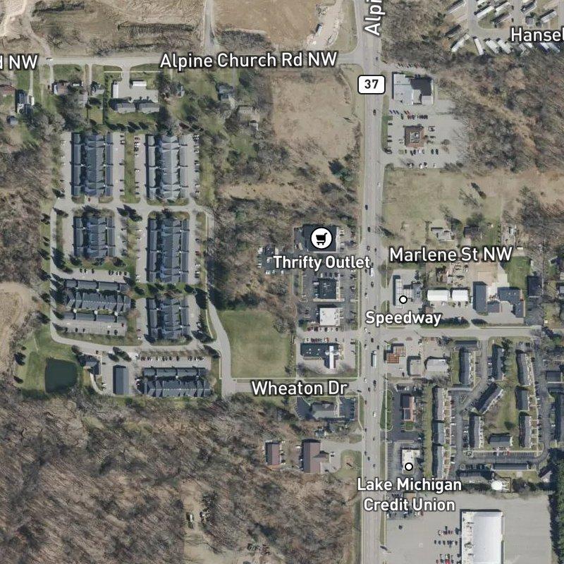 A quiet road lined with modest homes on half-acre lots, Country Estates sits just off 7 Mile Road in a corner of West Michigan where you're never far from what you need. Homes here run around $248K, and the subdivision spans 21 acres with room to breathe without pretending you live in the country. A grocery store sits steps away, a restaurant is a four-minute walk, and downtown Grand Rapids is eleven minutes by car—close enough that you're not commuting, far enough that you're not in it.