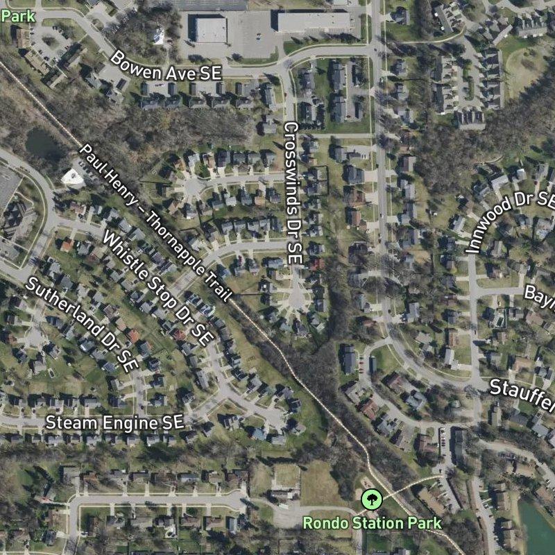 Crosswinds No.3 sits on six acres just east of the city, where modest lots—averaging a quarter-acre each—hold homes in the $328K range, close enough to downtown Grand Rapids that a fifteen-minute drive gets you there, yet anchored firmly in the quieter rhythm of the suburbs. The subdivision benefits from serious restaurant density; eighty-four dining spots sit within a mile, and the nearest one is just a five-minute walk, so dinner doesn't require a plan. Transit access is genuine here—the nearest bus stop lands six minutes on foot—and Rondo Station Park spreads nearby for the kind of quick outdoor break that makes a neighborhood feel less isolating. Kentwood Public Schools serves the area, and Gerald R. Ford Airport is only twelve and a half minutes away for those who need it. What sticks, though, is the practical density of everyday life: seven parks within walking distance, a grocery store at eleven minutes, coffee in nine, all woven into a grid where you're not marooned between car trips—just living at the reasonable scale that makes a place feel like it's actually yours.