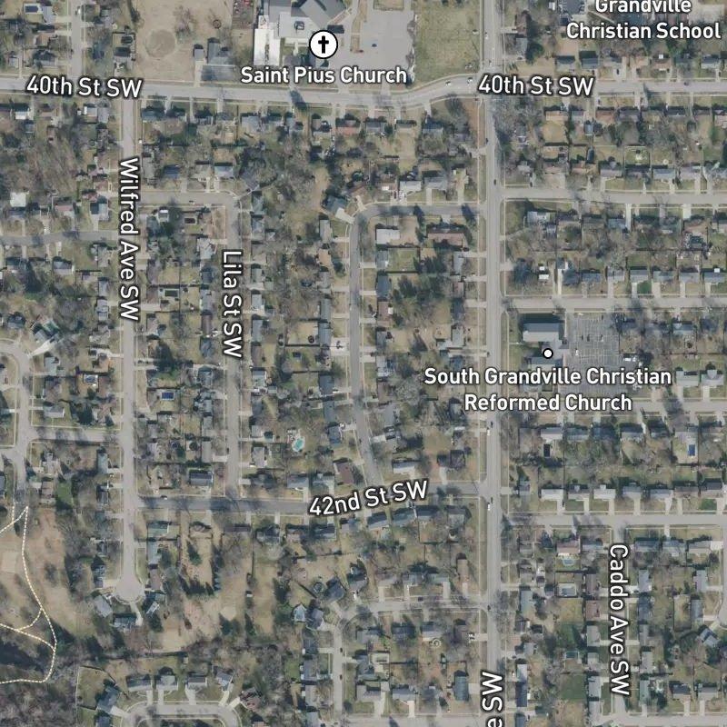 The sidewalks here are cracked enough to keep you honest, but a transit stop sits right at the edge of the subdivision—you're literally steps away from the bus line. D. & J. Van Singel Add. is a 14-acre pocket carved into the Douglas Add. Area, where Grandville Public Schools handles the education end and downtown Grand Rapids is about 16 minutes away by car. A grocery store and a restaurant are each within an easy walk, and Heritage Park lands 7 minutes on foot if the kids need to burn something off. The coffee shop runs about a mile, which is fine—this place isn't designed around wandering; it's designed around living, with 192 restaurants and 54 grocery stores within a couple of miles, and Kenowa Lake just over a mile down the road if you want to get away without actually leaving.