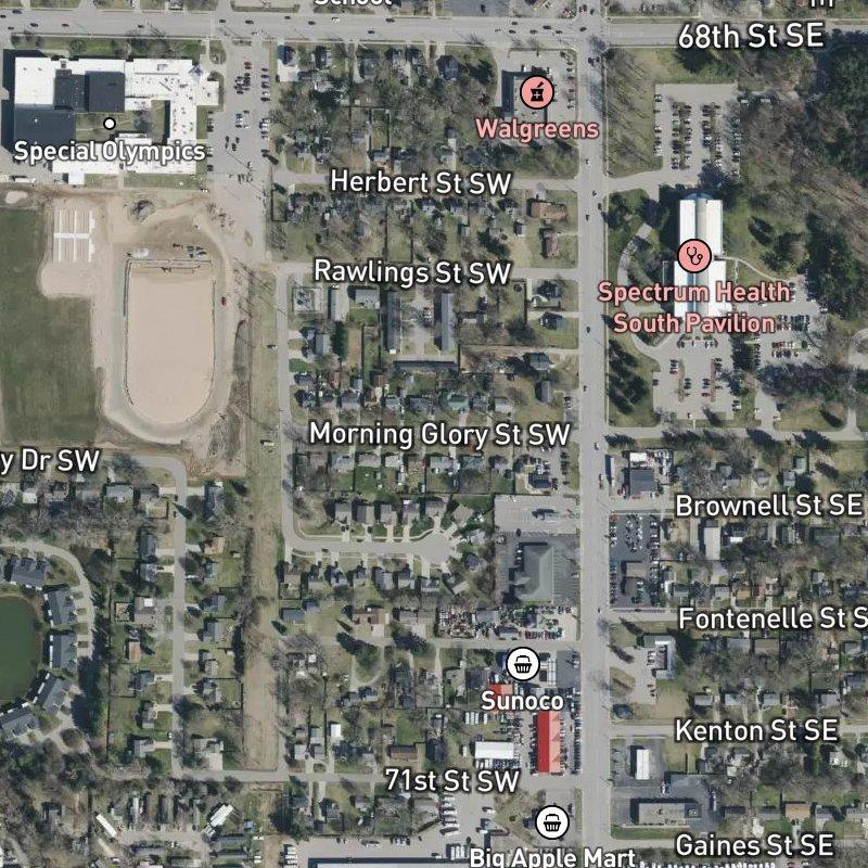 What surprises people about Douma Plat is how much you get for so little acreage—six acres carved into lots averaging just 0.22 acres each, homes running around $273K, and you're still close enough to downtown Grand Rapids to get there in 14 minutes. The subdivision's real draw is its location in the 76th Street Industrial Park Plat Area, which sounds grim until you realize it means you're surrounded by errands (grocery in a 5-minute walk, 18 stores within two miles, 60 restaurants within a mile). Transit access is immediate—a stop is practically at your door—and Gerald R. Ford Airport is just 17 minutes away by car. You won't find a coffee shop within walking distance, but that's about the only thing missing. Attend Kentwood Public Schools, and you've got a compact, utilitarian corner of West Michigan where location and convenience matter more than land size.