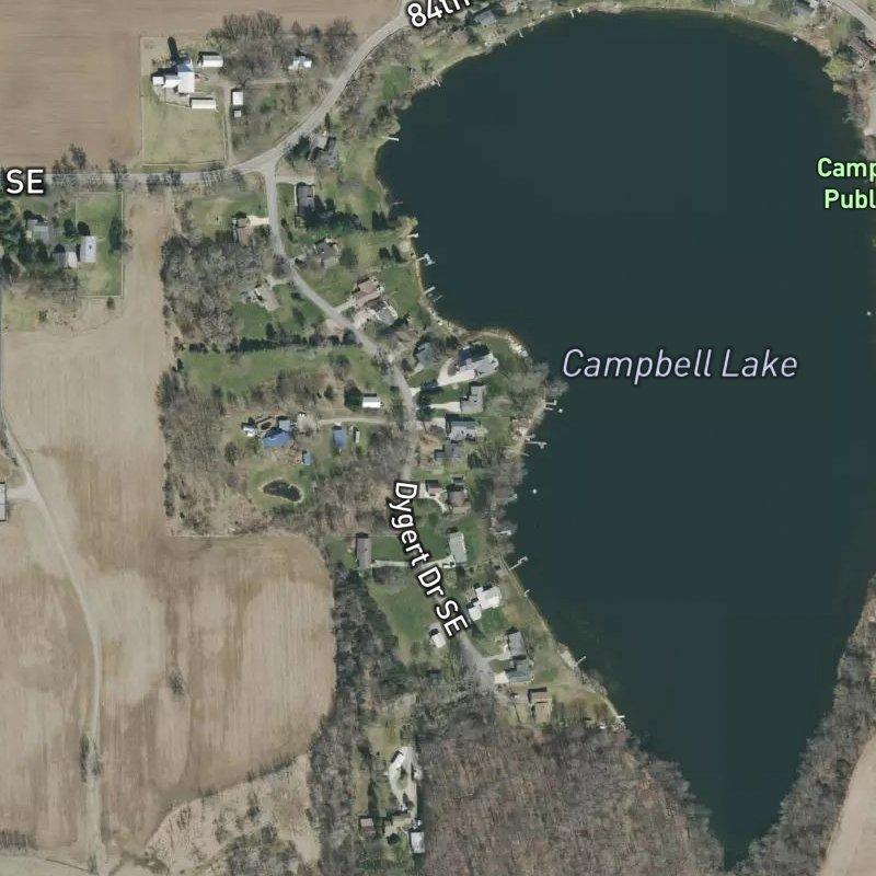 —and that's what makes Dygert Plat work: nine acres of modest lots, each one around a third of an acre, where homes sit in the $425K range. The subdivision has the feel of land that knows what it is—residential, settled, without pretense. Caledonia Community Schools serves the area, and you're close enough to the boat launch at Campbell Lake that a quick morning trip to the water is feasible, just under half a mile away.
