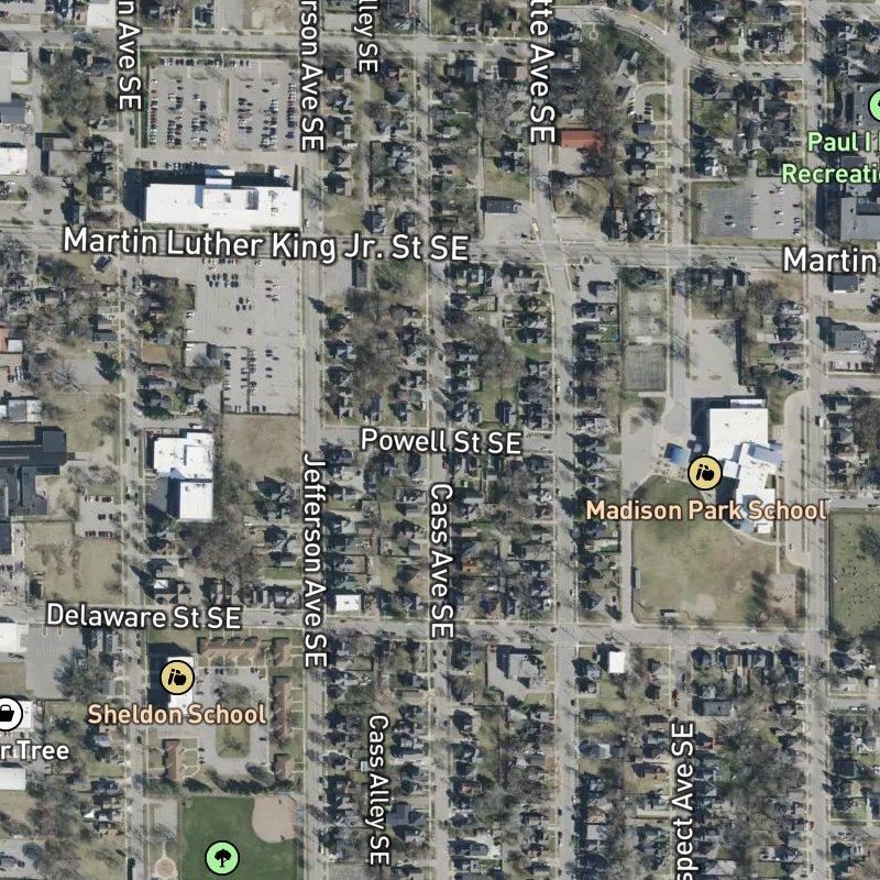 Early morning light hits this five-acre platted subdivision best—when the street trees are still casting long shadows and you can actually see the bones of the place. E. Powell's Sub. sits in the Southeast community, about four minutes from downtown Grand Rapids, with homes running around $171K and lot sizes averaging just over a tenth of an acre each. The transit stop is practically at your door, and Rasberry Field is a five-minute walk, part of a cluster of 15 parks within a mile—useful when you've got no yard to speak of. A restaurant is walking distance, coffee a ten-minute stroll, and the grocery store sits less than a mile away. Butterworth Park Launch is 1.4 miles out if you've got a boat. Homes here attend Grand Rapids Public Schools, and Gerald R. Ford Airport runs 23.7 minutes by car when you need it. It's dense, walkable, and straightforward—this is what urban infill actually looks like.