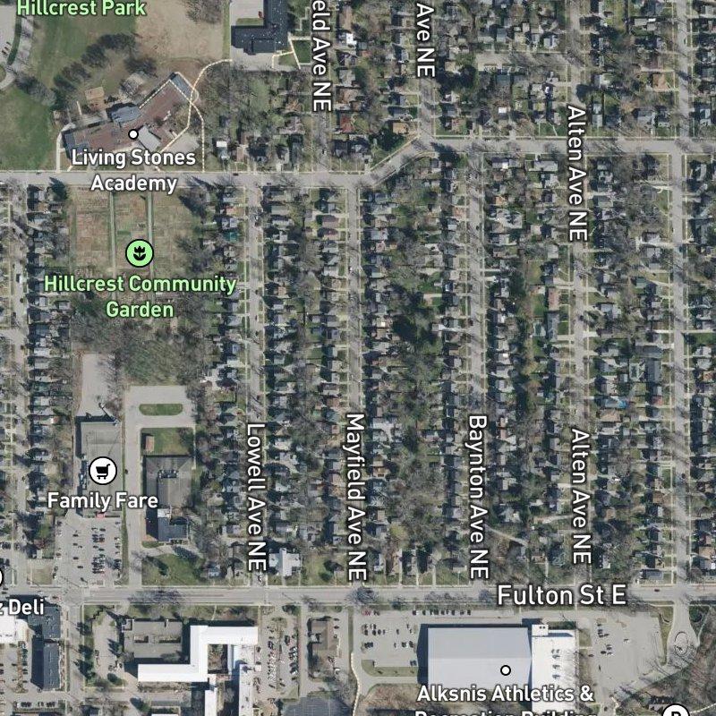You'll feel the pace shift the moment you turn onto these tree-lined streets—ten acres tucked into Fulton Heights, where you're never more than a few minutes from coffee, groceries, or a restaurant, yet the blocks themselves stay residential and calm. The walkability here leans toward real: a coffee shop and a grocery are each a quick walk away, dining options number in the hundreds within a mile, and you can hit Hillcrest Park in five minutes on foot. Transit stops sit practically at your doorstep, and downtown Grand Rapids is about six minutes by car if you need it. Homes here run around $341K on lots averaging about 6,000 square feet—modest by today's standards, which means the subdivision maintains its character without feeling stretched thin. The neighborhood association keeps things moving with regular events and bike rides, and if you've got a dog, there's a park six minutes away that gets plenty of use.