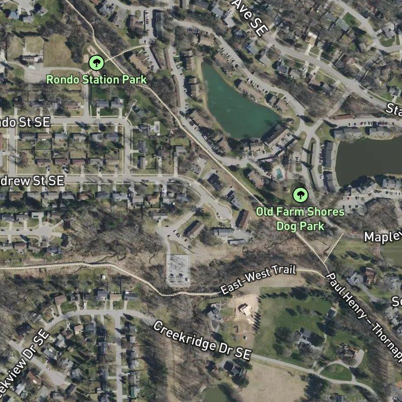 Seven acres of modest suburban plots—each running about a third of an acre—anchored in the Crosswinds No.2 Area between downtown Grand Rapids and Gerald R. Ford airport, which sits just over 13 minutes away by car. Eastbrook Gardens feels like the kind of place where you're not paying for grand gestures; homes here run around $355K, and what you get is proximity—to 78 restaurants and 36 grocery stores within a mile or two, to Kentwood Public Schools, and to Old Farm Shores Dog Park, a two-minute walk from your door. Downtown is 17 minutes off, coffee shops cluster nearby, and a transit stop sits ten minutes on foot, which means you can live here without treating the car as your only option. It's a tidy grid of moderate houses in a place where you're close enough to everything that you don't have to choose between access and space.