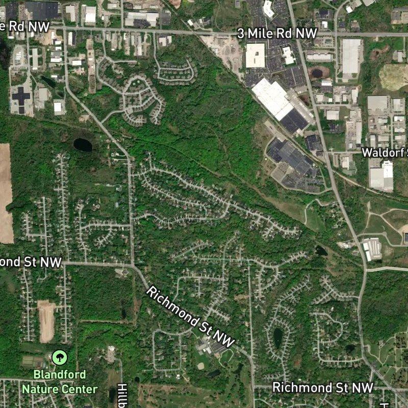 Most subdivisions don't come with 125 acres of their own green space, but Elmridge Estates essentially does—the development sits on the edge of what amounts to a sprawling outdoor corridor, with Blandford Nature Center less than a mile away and Richmond Park's trails, pool, and sledding hill close behind. You're 15 minutes from downtown Grand Rapids, which means you get the suburban quiet (mid-century ranches and newer builds on good-sized lots) without the exile, and a dozen restaurants plus a grocery and coffee shop all within walking distance if you feel like it. Homes run around $503K, and you're in the Grand Rapids Public Schools district. It's the kind of place where you didn't have to choose between space and access—the developers just handed you both.