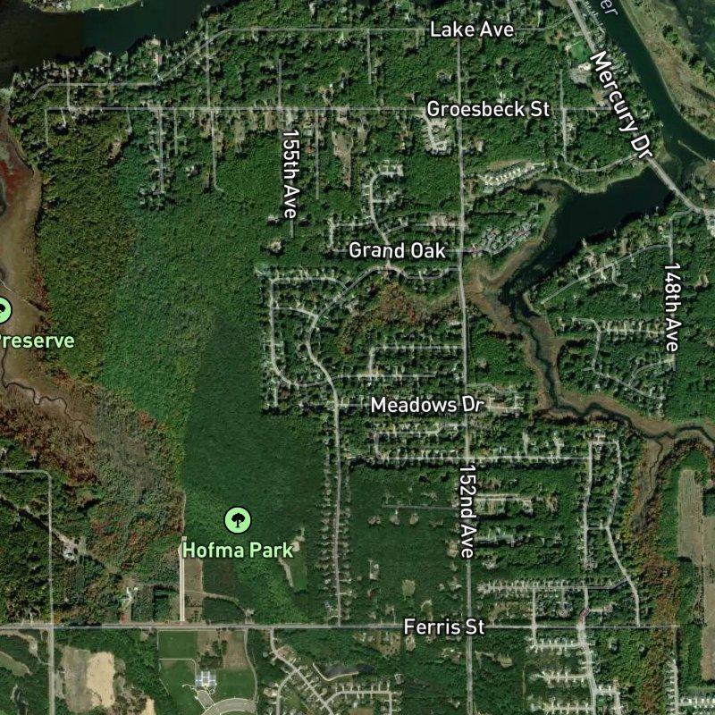 The moment you pull in, you notice the trees—this 140-acre subdivision is threaded through with them, and Hofma Park sits just a ten-minute walk away if the mood strikes. It's solidly suburban, with homes running around $448K, and you're positioned close enough to Grand Haven's beach (about twelve minutes) that weekend trips don't require negotiation, though downtown Grand Rapids is nearly forty-five minutes south if you need to go that far. The tradeoff is that the nearest grocery, restaurant, and coffee shop all hover in the 2-to-3-mile range, so you're definitely driving for errands—but three parks within a mile mean there's green space embedded in the everyday. Kids here feed into Grand Haven Area Public Schools, and the whole setup has that deliberate, low-key feel of a place that isn't trying to be anything but itself.