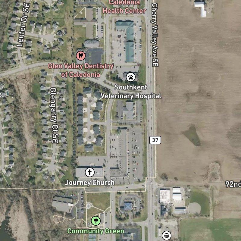 This fifteen-acre business center sits on the east side of Grand Rapids, right at the intersection of 92nd Street and Kraft Avenue, with clear sightlines toward open land and the kind of straightforward commercial landscape that doesn't pretend to be anything else. You're about ten minutes from Gerald R. Ford International Airport and close enough to downtown that a commute doesn't feel like a burden—roughly twenty-six minutes if you're heading that direction. Emmons Lake is less than half a mile away, and Community Green park is just a four-minute walk, which means green space isn't something you have to hunt for.