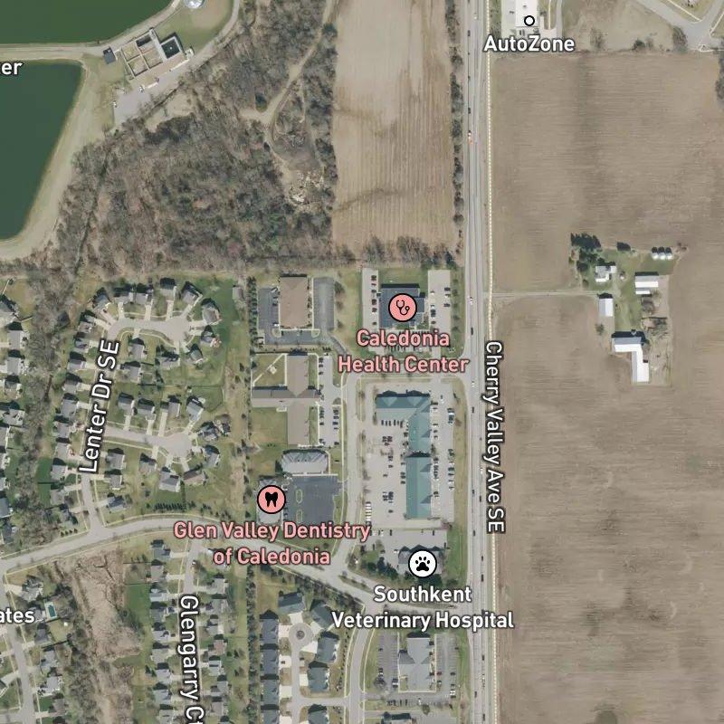 So you've got a 10-acre platted subdivision that punches well above its weight for logistics—Gerald R. Ford Airport is under 10 minutes away, which means if you're commuting that direction, you're barely awake before you're there. Downtown Grand Rapids sits about 26 minutes out, far enough to feel separate but close enough that you're not sacrificing access to the city. Schools feed into Caledonia Community Schools, and the immediate surroundings are genuinely convenient: forty-some restaurants within a mile, a grocery store an 11-minute walk off, a dog park nine minutes away if your dog has opinions about your schedule. Emmons Lake is less than a mile south, Community Green is an easy walk, and there are four parks within a stone's throw. It's the kind of location where "running out" doesn't require a long drive, and that matters more than most people admit until they live it.