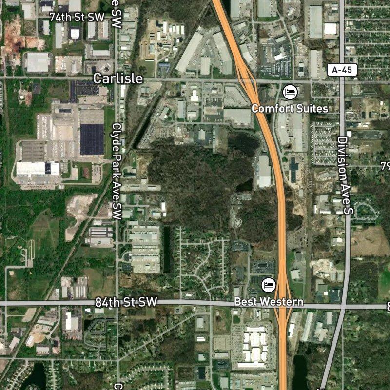 So you've got this industrial square that's basically right in the heart of Byron township — about 15 minutes from downtown Grand Rapids if you're heading that direction — and it's 466 acres of solid commercial and light industrial space where things actually *work*. Coffee shops and restaurants are literally steps away, which is rare for an area like this; you've got 36 spots to eat within a mile and a dozen grocers within two miles, so it's not some isolated pocket. The median sale price hovers around $361K, and Byron Center Public Schools serves the area. There are a couple parks nearby — Douglas Walker Park is about a 15-minute walk — plus you're close enough to Gerald R. Ford Airport (20 minutes) that logistics companies and distribution centers don't have to sweat it. It's the kind of place where businesses can actually operate without friction, and the walkability to dining and services makes it less of a sterile business zone and more of a functioning neighborhood mixed-use area.