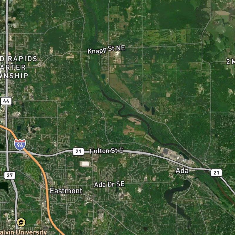This area along Grand River and Pettis sits just 14 minutes from downtown Grand Rapids, yet the neighborhood itself feels deliberately removed from the city's pulse—3,782 acres of contemporary brick and stucco homes where the median sale price hits $804K. You're steps from both groceries and restaurants, with 24 dining options within a mile, but the real draw is proximity to Forest Hills Public Schools and the recreational spine that defines Ada township: over 30 miles of paved bike trails wind through the area, with Roselle Park just under a mile away. The Grand River itself is part of the geography here, close enough that the Knapp Street Bridge Launch sits a quick 2-mile drive away for anyone with a boat. This is suburban land with substance—not oversized lots, but genuine acreage—where you're buying into both a school district and an access point to the broader township's mix of conservation, trails, and what passes for village character a short drive south.