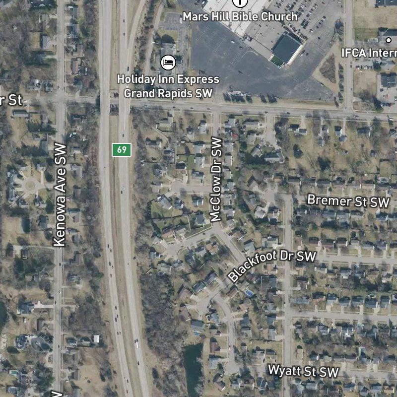 The driveway slopes in, and you're suddenly ringed by ten acres of modest homes on quarter-acre lots—the kind of place where you can actually see your neighbors' porches but not feel crowded by them. Grandville Homesites sits in the Sutton Estates Area, about 14 and a half minutes from downtown Grand Rapids, with a grocery store a ten-minute walk away and a restaurant just four minutes on foot. There's a transit stop three minutes out, Kenowa Lake a quick third of a mile down the road, and a boat launch at Grandville Launch for anyone with a canoe in the garage. Grandville Public Schools serves the subdivision. Homes here run around $389K, and the neighborhood sits within reach of three parks, including Wedgwood Park about fourteen minutes' walk away—the kind of setup where you've got both space and access without having to plan your whole life around a car.