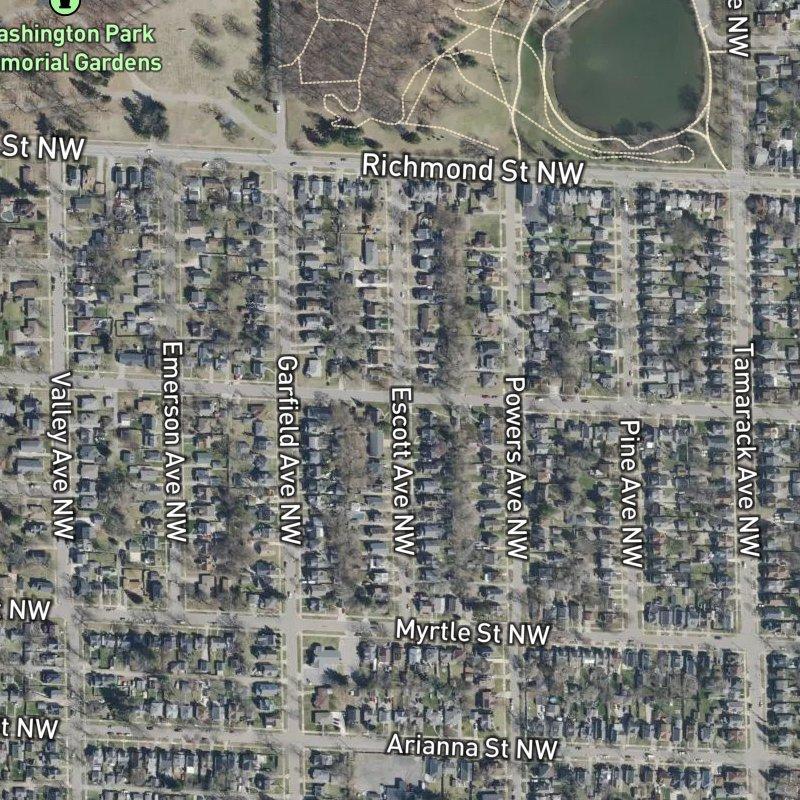 If someone asks you where Grove & Brewers Add. is, just say it's in West Grand, the sprawling neighborhood just two miles from downtown Grand Rapids — close enough that a drive takes about eight and a half minutes when traffic cooperates. The subdivision itself spans twenty acres of tightly platted lots averaging a fourteenth of an acre each, the kind of density that keeps you within a four-minute walk of a restaurant and means there are nearly eighty dining spots within a mile if you're the type to have options. Homes here run around $254K, which reflects what you actually get: proximity to Grand Rapids Public Schools, Richmond Park seven minutes on foot, and the neighborhood's working infrastructure — a transit stop five minutes away, a grocery within nine-minute walking distance, the whole ecosystem already built. The real detail is that you're not choosing between "close to things" and "having space"; you're choosing between them, and Grove & Brewers Add. has made the bet that close wins.