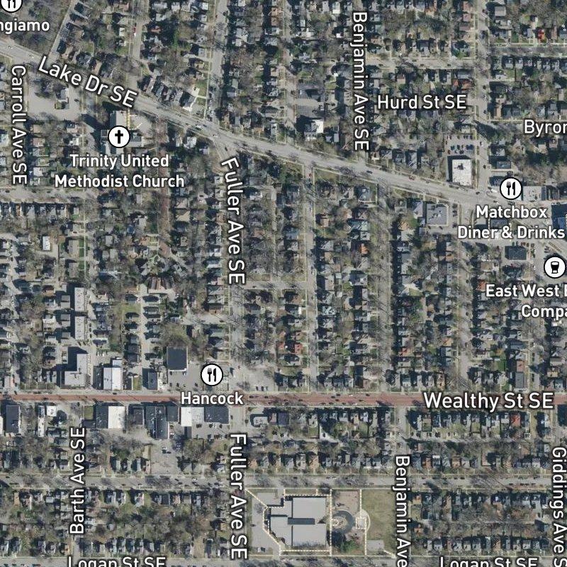 The corner coffee shop is steps away, and so is dinner—pick from nearly 290 restaurants within a mile, many along the Wealthy Street and Lake Drive corridors that define Eastown. H. D. Carpenters Add. sits in the heart of this 70-block walkable neighborhood, where 9 acres of modest lots (averaging 0.12 acres) hold homes that run around $460K. You're five minutes from downtown Grand Rapids, with transit stops at your doorstep and Grand Rapids Public Schools serving the area. Sigsbee Park is a four-minute walk, and 15 parks sit within a mile—plenty of green without leaving the block. A grocery store is equally close, making errands quick work in a neighborhood where walkability scores high across the board.