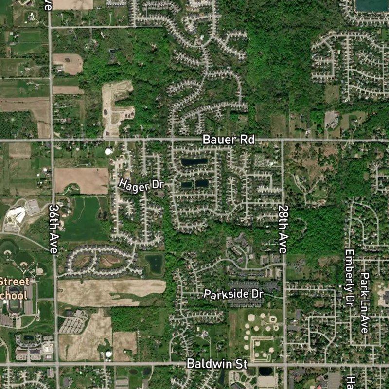 The first thing you notice pulling into Hager Park West is the space—nearly 50,000 square feet of lot per home, which means actual breathing room between houses and genuine yards instead of postage stamps. This 63-acre subdivision sits in the 36th Avenue & Bauer Road Area, about 21 minutes from downtown Grand Rapids, far enough out that you're not hearing much traffic but close enough that the city isn't a production. Homes here run around $885K, and they're built on the assumption that you want land; the median lot sits just under half an acre. Hudsonville Public School District serves the area. Hager Park itself is a 12-minute walk away if you need it, and there are a couple other parks within a mile. Groceries and restaurants cluster about 1.4 miles down the road—not walkable errands, but a short drive. A coffee shop is reachable on foot if you're willing to make the trip.