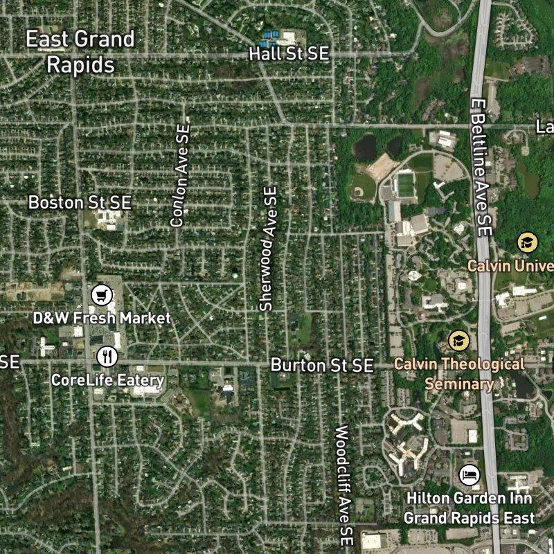 Your daily drive to Gerald R. Ford Airport takes about 14 minutes—short enough that a flight before noon doesn't feel like a planning nightmare. Hampshire Highlands sits within Ridgemoor Park, a 58-acre subdivision of quarter-acre lots where colonial and ranch homes run around $362K, close enough to downtown Grand Rapids (15 minutes) that you're not sacrificing access for space. The grocery is a 7-minute walk, coffee another 7, and 72 restaurants cluster within a mile, so the errands don't pile up into a road trip. A transit stop sits steps away if you need it. Calvin University Ecosystem Preserve anchors the area a mile out, and Reeds Lake—worth the short drive—offers a real break from the residential grid. Schools fall under Grand Rapids Public Schools, and the whole setup feels like the kind of place where you can actually get somewhere without planning it three days ahead.