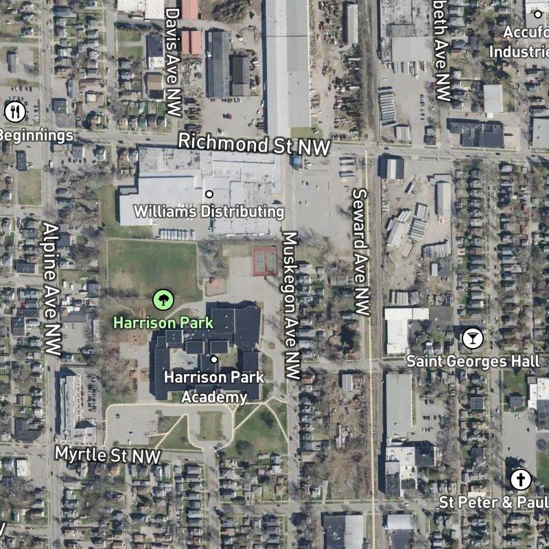 Biking or driving through Harrison Park Plat, you're moving through tight blocks of modest homes on small lots—the kind of neighborhood where a corner grocery is a five-minute walk and a restaurant is practically next door. It's dense in the way that makes errands feel doable without much planning, and the park that gives the plat its name sits right at the edge, offering basketball courts and a playground within steps of the street. Homes here run around $258K, and the median lot size is roughly 5,600 square feet, so you're buying proximity to West Grand rather than acreage. A six-minute drive puts you in downtown Grand Rapids; the nearest transit stop is a walk away, and you're surrounded by over 120 restaurants within a mile—everything from taquerias to brewpubs that anchor the neighborhood's reputation. Enrollment happens through Grand Rapids Public Schools.