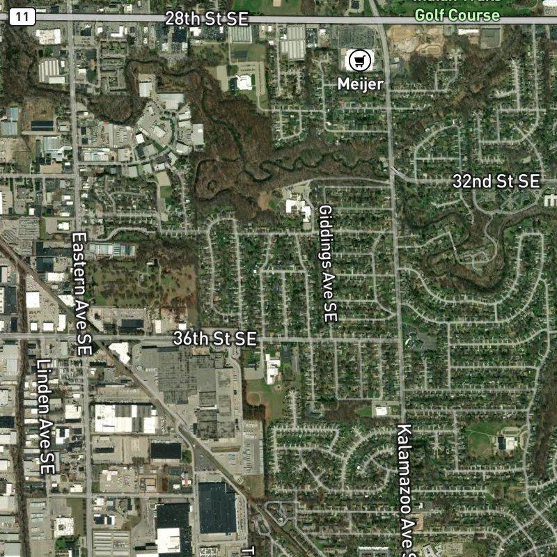 Hickory Ridge sits on the southeast side of Grand Rapids, tucked into Ken-O-Sha Park, where you're about 12 minutes from downtown and 16 minutes from Gerald R. Ford airport—which means you get suburban breathing room without sacrificing access. The subdivision spans 58 acres of mid-century ranch and raised ranch homes clustering on modest lots (averaging 0.31 acres), with a median value around $301K. You're a nine-minute walk from Ken-O-Sha Park itself, where the Plaster Creek Trail kicks off and there's a wooden "Amplifier" structure that actually channels creek sounds if you climb into it—the kind of detail that makes a neighborhood feel less like a grid and more like a place. Forty-eight restaurants and 42 grocery stores sit within a mile or two, and a transit stop is five minutes on foot. Grand Rapids Public Schools runs the schools here.