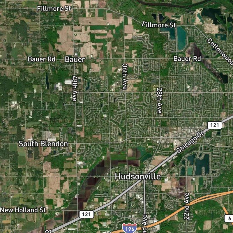 Brewer Pond cuts through the middle of this 2,383-acre area in Georgetown charter township, a suburban expanse of ranch homes that sprawls across what used to be lumber country around Rush Creek. You're about 22 minutes from downtown Grand Rapids, which means the space here—room to breathe, actual yards—doesn't require you to sacrifice access to anything. A grocery store is a two-minute walk, and you've got thirty restaurants within a mile, so the "suburban" part doesn't mean driving everywhere; it means having land without isolation. Hudsonville Public School District serves the area, while Rush Creek Park sits just a mile away if you want something closer than that. Homes here run around $413K, which buys you the ranch-style standard that defines this neighborhood—straightforward, unpretentious, the kind of place where the appeal is built into the setup, not the mythology.