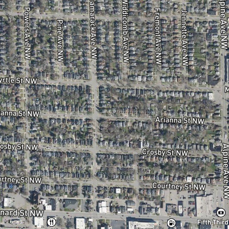 What catches people off guard about Hunters Sub. is how much you get on nine acres—modest lots, tight-knit blocks, and the kind of density that still feels residential rather than cramped. Homes here run around $225K, and you're close enough to Harrison Park (a seven-minute walk) that the neighborhood doesn't feel landlocked. A restaurant is three minutes on foot, a coffee shop fourteen, and the nearest grocery a seven-minute stroll. Grand Rapids Public Schools serve the area, and downtown is just 7.2 minutes away by car when you need it.