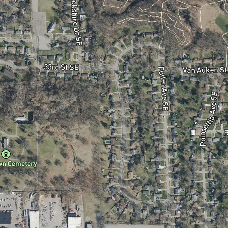 You wake up here and you're 12 minutes from downtown Grand Rapids, but you don't feel like you're in the city—you're in Ken-O-Sha Park, a 25-acre subdivision on the southeast side where tree-lined streets and mid-century ranch homes make it feel like you've landed in quiet suburban space. Ken-O-Sha Park itself, the 100-acre green space anchoring the neighborhood, is an 8-minute walk away, home to a 1.6-mile loop trail and that wild wooden "Amplifier" structure that captures creek sounds when you climb inside. The airport is 16 minutes out if you need it.