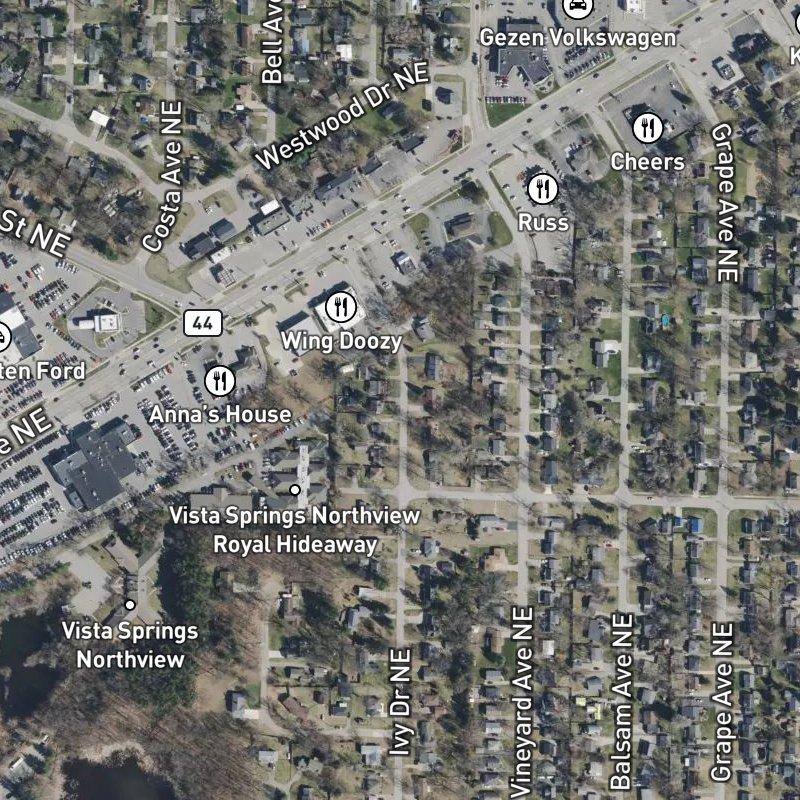 Plainfield Avenue runs straight through this seven-acre subdivision like the spine of something deliberate, and from here downtown Grand Rapids is just over twelve minutes by car—close enough that you're not commuting, far enough that you're not living in the thick of it. Homes run around $310K on quarter-acre lots, which means the whole place feels assembled rather than sprawling. A grocery store is a seven-minute walk, a coffee shop five minutes, and there are 132 restaurants within a mile, which sounds absurd until you realize most are actually good; dining scores an 8 out of 10 here, so you're not eating chain food out of desperation. Northview Public Schools serves the area, and Dean Lake Park—where you can actually see water and trees instead of just imagine them—is a seven-minute walk away. The Rogue River Mouth Launch sits 2.7 miles out if you're the type to load a kayak on weekends, which, in this corner of Michigan, enough people are.