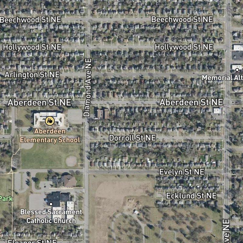 Jansma Plat sits five acres in the North End, where the daily rhythm centers on quick access rather than isolation. Downtown Grand Rapids is under ten minutes away by car, and a transit stop lands just a two-minute walk from here—which means errands don't eat your whole afternoon. Aberdeen Park is a five-minute walk, and you've got four parks within a mile total. The neighborhood runs dense with purpose: thirty restaurants within walking distance, eighteen grocery stores within two miles, and the Grand River boat launch at Comstock Riverside Park is about a mile and a half south.