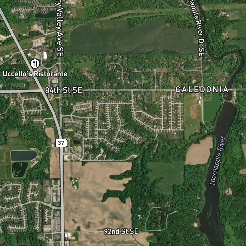 So you're basically 10 minutes from the airport, which means you can get downtown Grand Rapids in about 26 minutes if traffic doesn't decide to have an existential crisis—and there are 30 restaurants within a mile, so you won't starve while waiting to leave. This 103-acre 100th St & Whitneyville Ave Area subdivision runs around $415K and feeds into Caledonia Community Schools, and the bones are solid: two parks within walking distance, LaBarge Dam Recreation Area just under a mile away, and Emmons Lake about a mile and a half for anyone who actually uses that stuff. A grocery store sits a mile out, a coffee run is 1.7 miles, but there's a restaurant a three-minute walk if you need to eat right now—which, given the 30 options nearby, you probably will.