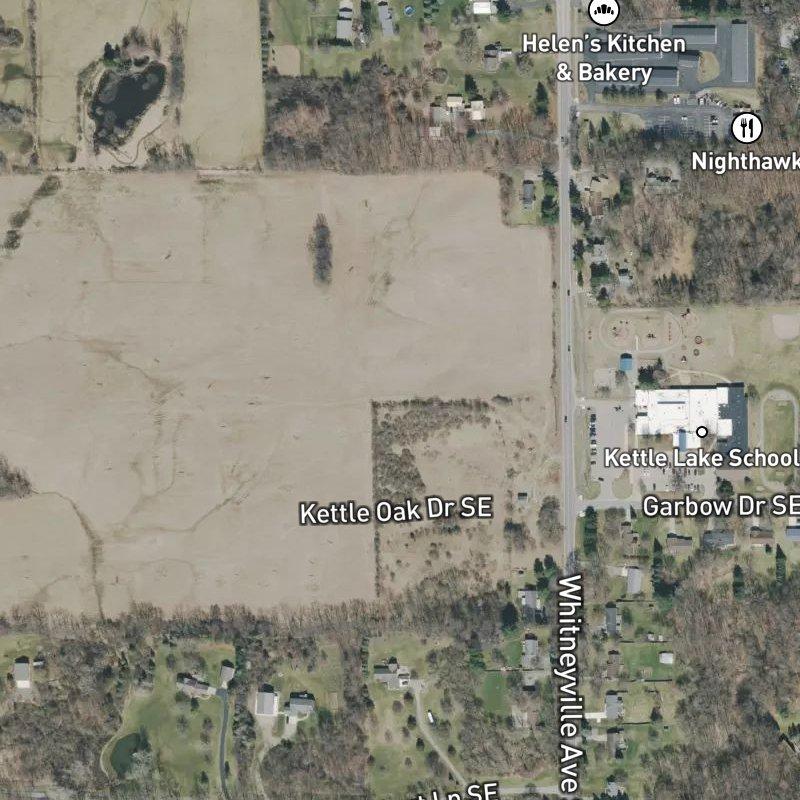 The lake is what stays with you—Kettle Lake sits just over half a mile away, close enough that you can plan a morning around it without leaving early. This 26-acre condo community lives in that sweet spot where you're still genuinely suburban, with traditional homes and plenty of green space, but you're not far from what matters: a restaurant is practically next door (18 within walking distance if you explore), three parks sit within a mile, and the nearest boat launch at Campau Lake is less than a mile away if water is your thing. Getting to Gerald R. Ford airport takes about 12 minutes, and downtown Grand Rapids runs closer to 26 minutes, which means commuting feels manageable without feeling like you're living on the edge of everything. The trade-off is that serious grocery shopping means a drive—the nearest supermarket is 3.7 miles out—but that's the kind of detail that matters less once you realize how walkable the immediate surroundings actually are.