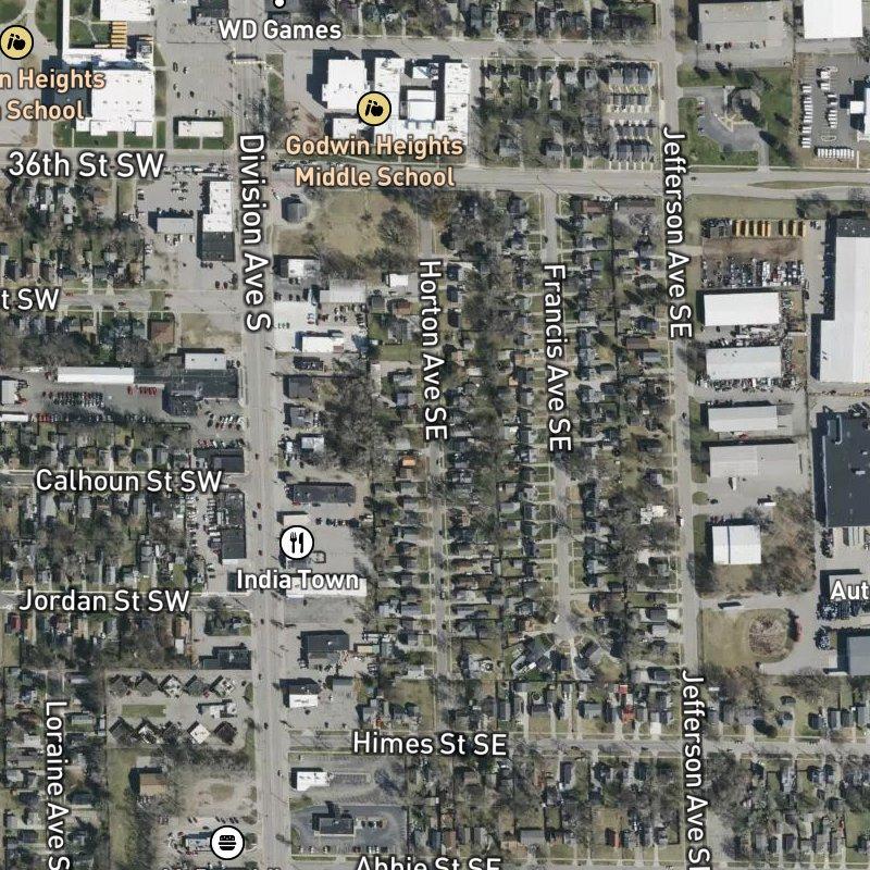 Keyes-Buck Plat is a 10-acre subdivision where the lot lines are tight—0.16 acres each—and the pace feels more suburban than rural, with restaurants within steps and a transit stop equally close. Downtown Grand Rapids sits just under 9 minutes away by car, while the airport lands at about 17 minutes, making it a reasonable setup for commuters who don't mind trading space for proximity. Homes here run around $207K median, and the Godwin Heights Public Schools district serves the area. The real texture comes from what's within walking distance: 24 restaurants and 4 parks packed into the surrounding mile, a grocery within a 12-minute walk, and a coffee shop another minute or two beyond that. It reads less like a secluded pocket and more like a compact grid plugged into something larger—which, in West Michigan terms, means you're close enough to hubs but still sitting on your own patch.