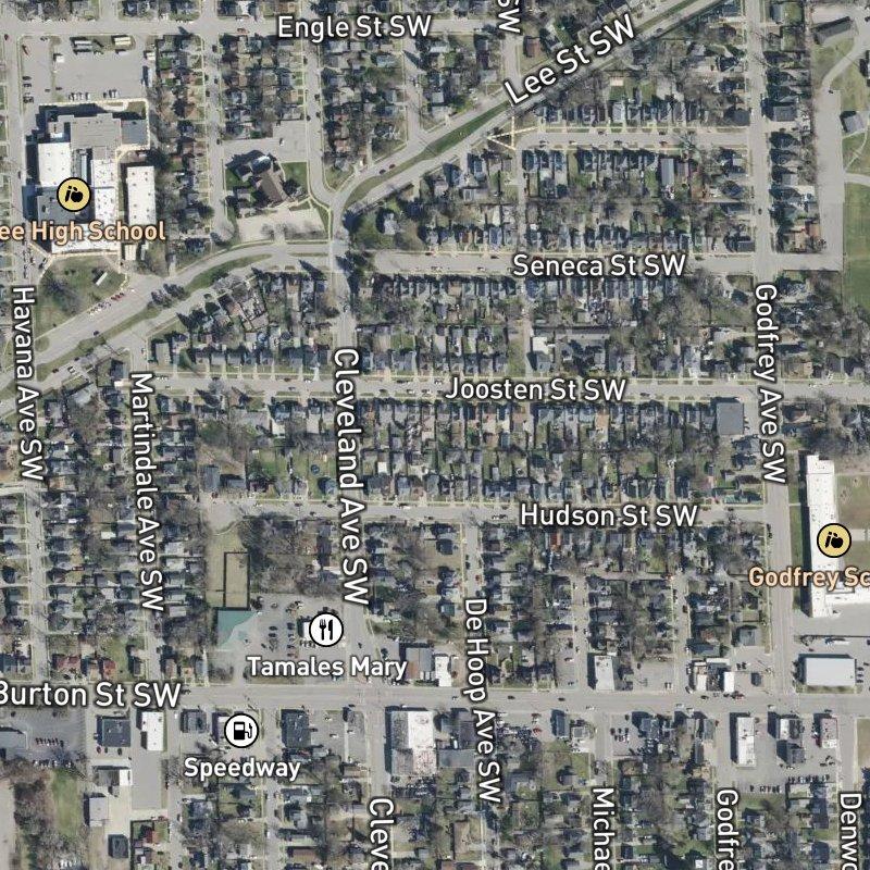 The lots here are small and tight—think 0.14 acres—which means you're living shoulder-to-shoulder with neighbors in a way that actually works because everything's close by. A restaurant is steps away, the nearest transit stop is right there, and downtown Grand Rapids is just 7 minutes when you need it. Homes run around $228K, and you're attending Godfrey-Lee Public Schools.