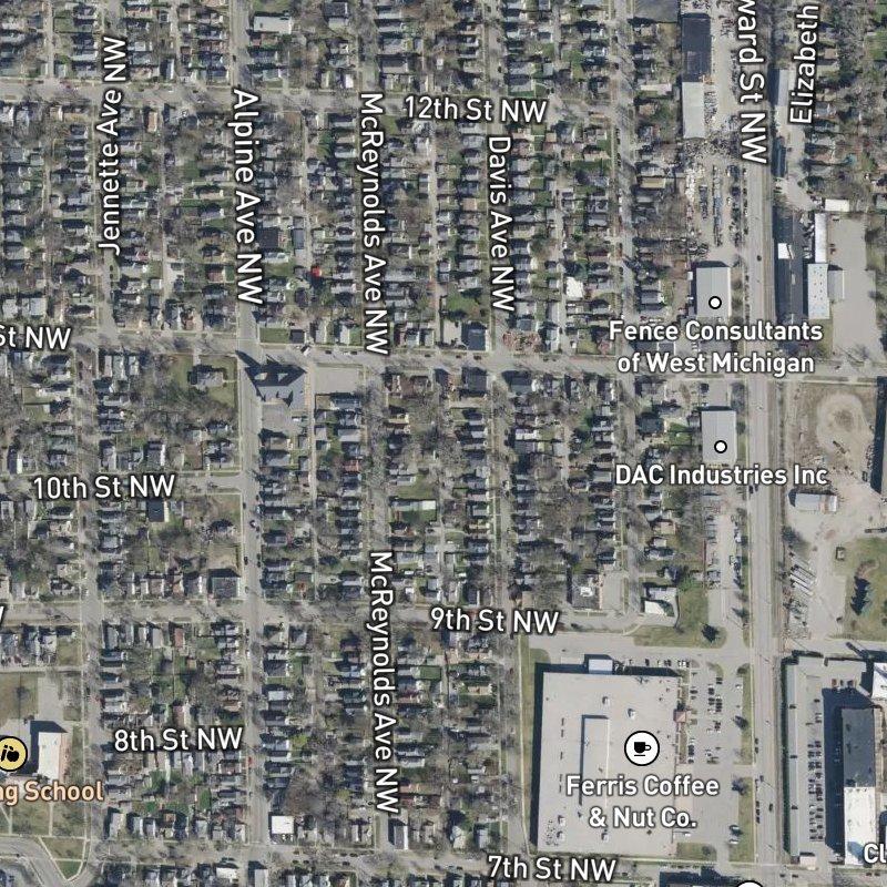 This 46-acre subdivision sits right in the thick of West Grand, where you're literally steps from a transit stop, grocery stores, and restaurants — we're talking 240 dining spots within a mile if you want options. The median home value hovers around $223K, and the lots are compact at about 0.11 acres each, which means less lawn to mow and more time actually doing something. Nagold Park is a 10-minute walk away, and there are 12 parks within a mile total. Downtown Grand Rapids is just 6 minutes by car, so your commute won't eat your morning. Grand Rapids Public Schools handles the schools here. Errands and dining score high on walkability — 8 out of 10 for both — and transit access is a solid 10, which matters when you're in a dense suburban pocket where everything's close and the neighborhood still somehow feels manageable.