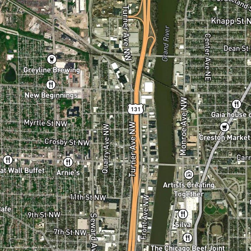 Sitting just two miles from downtown Grand Rapids in the heart of West Grand, Leonard & Cos. Add. puts you within a five-minute drive of the city center while keeping you rooted in a 126-acre neighborhood with real room to breathe. You're surrounded by a dense cluster of 180 restaurants within a mile—everything from taquerias to breweries that helped define Grand Rapids' beer reputation—and a grocery store is a three-minute walk away. Harrison Park, with its baseball fields and tennis courts, sits eight minutes on foot, and seven parks total fall within a mile of home. Transit access is immediate, with stops practically at your doorstep, while the Grand River and its Fish Ladder are less than a mile south. Homes here run around $219K on average, with lots typically under 0.15 acres, and you're zoned for Grand Rapids Public Schools. Downtown coffee shops are a ten-minute walk; getting to Gerald R. Ford Airport takes about 22 minutes by car.